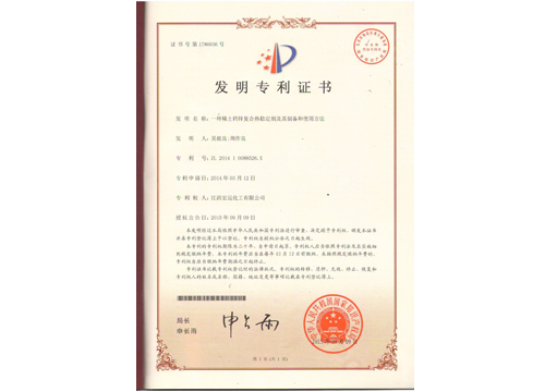 (宏遠化工“稀土鈣鋅復合熱穩定劑及其制備和使用方法”獲國家專利)2015年9月9日,中華人民共和國國家知識產權局,授權公告江西宏遠化工有限公司“一種稀土鈣鋅熱穩定劑及其制備和使用方法”獲國家發明專利,授權公告號:CN 103865796 B,專利號:ZL 2014 10088526X。
